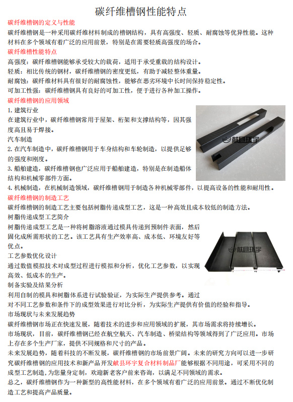总之,碳纤维槽钢作为一种新型的高性能材料,在多个领域有着广泛的应用前景。通过不断优化制造工艺和提高产品质量。